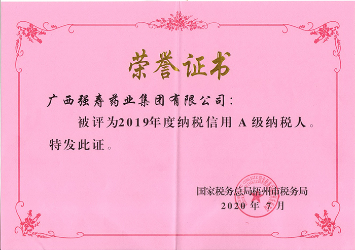 近日,國家稅務(wù)總局梧州市稅務(wù)局公布了2019年納稅信用評價工作情況,其中,廣西強壽藥業(yè)集團有限公司(簡稱“強壽集團”)憑借誠信納稅的良好信譽,被評為“2019年度納稅信用A級納稅人”,并喜獲《納稅信用A級榮譽證書》。