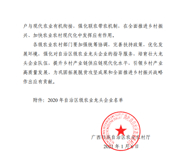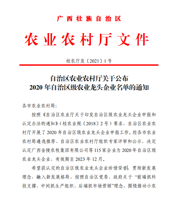 2021年1月6日 ,廣西壯族自治區(qū)農(nóng)業(yè)農(nóng)村廳公布了最新的2020 年自治區(qū)級(jí)農(nóng)業(yè)龍頭企業(yè)名單,其中包括 14個(gè)市的115家企業(yè)。本次遴選由各市農(nóng)業(yè)農(nóng)村局、自治區(qū)農(nóng)業(yè)農(nóng)村廳組織專(zhuān)家評(píng)審和公示,并最終決定。因廣西強(qiáng)壽藥業(yè)集團(tuán)強(qiáng)化“龍頭企業(yè)+企業(yè)+基地+農(nóng)戶(hù)”的模式帶動(dòng)周邊農(nóng)戶(hù)從事中草藥種植,扶助農(nóng)民走上致富之路成績(jī)顯著。本次榮獲“自治區(qū)級(jí)農(nóng)業(yè)龍頭企業(yè)”殊榮。