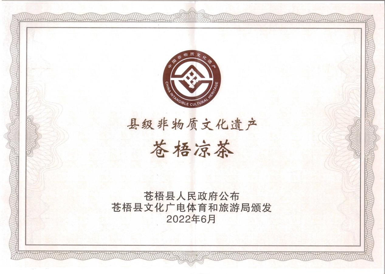 2022年6月,蒼梧涼茶成功申請(qǐng)非物質(zhì)文化遺產(chǎn)!由蒼梧縣人民政府公布,蒼梧縣文化廣電體育和旅游局頒發(fā)縣級(jí)非物質(zhì)文化遺產(chǎn)證書。