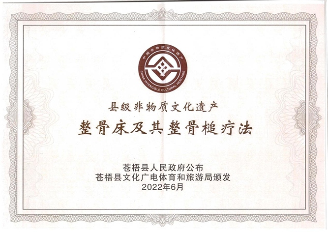 熱烈祝賀廣西強(qiáng)壽藥業(yè)集團(tuán)有限公司整骨床及其整骨槌療法喜獲縣級(jí)非物質(zhì)文化遺產(chǎn)項(xiàng)目。證書由蒼梧縣人民政府公布,蒼梧縣文化廣電體育和旅游局頒發(fā)。